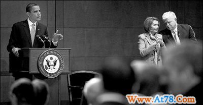 3月20日,奥巴马(左)在国会对众议院民主党人发表讲话。新华社/法新