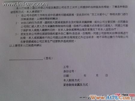 富士康要求员工签署的不自杀协议