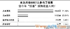 上周,中国证券网进行了“您今年‘投基’预期收益几何”的调查,共有6057人参与了投票。结果显示,4325名投票者选择了“跑赢通胀”,这部分投票者占全部投票人数的71.40%;与此同时,有1432为投票者选择了“跑赢指数”,该部分投票者占全部投票人数的23.64%;206名参与者选择了“追求绝对收益”,占比3.40%;仅有94位参与者将今年投资的预期收益定位在“保本即可”,这部分占全部投票人数的1.55%。