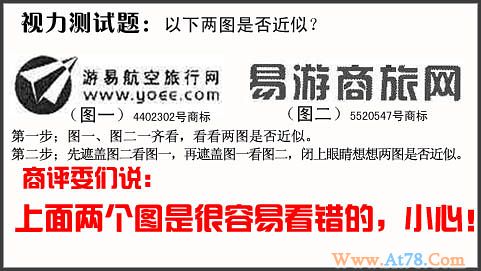 如图易游商旅网是2006年申请的商标,另一商标为“图+游易航空旅行网+YOEE”,工商总局商标局、商评委商标评审委员会历时4年先后都以两商标近似而无法分辩为由而驳回"易游商旅网"的注册申请。