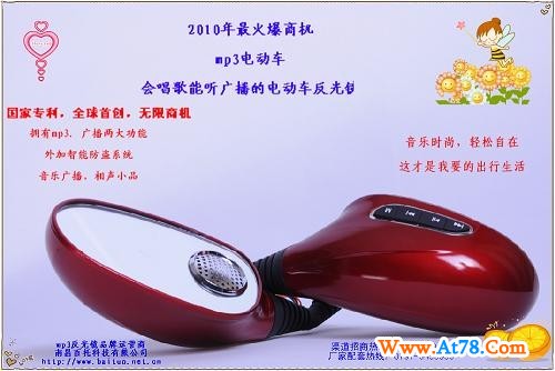 目前我们经营的电动车、摩托车后视镜MP3的高保真立体声音乐设计,不仅可以用来收听广播、播放音乐、相声、小品等多种格式文档,甚至可以用它播放英语学习卡、诗歌朗诵卡等。它不仅能说会唱,而且又防水又防震,安装及使用也非常的便捷,再加上大众化的价格定位,让出行成为一种享受不再是有钱人的专利。