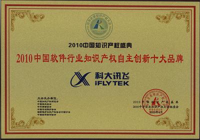 近日,由中国知识产权研究会、中国专利保护协会、中国版权协会等单位联合举办的“2010中外企业知识产权大会”在人民大会堂隆重举行。在当日的“2010中国知识产权盛典颁奖典礼”中,科大讯飞凭借强大的自主创新能力以及在知识产权创造、保护与应用方面的突出表现获评“2010年中国软件行业知识产权自主创新十大品牌企业”。
