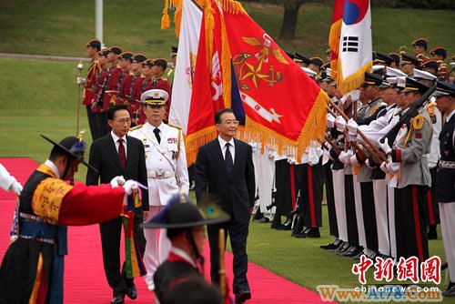 5月28日,韩国总统李明博在青瓦台大草坪举行欢迎仪式,欢迎中国总理温家宝对韩国进行正式访问。