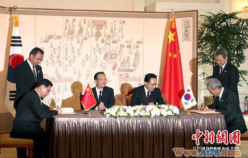 温家宝与李明博还共同出席了关于中国-韩国自由贸易区官产学联合可行性研究的谅解备忘录等双边合作文件的签字仪式。