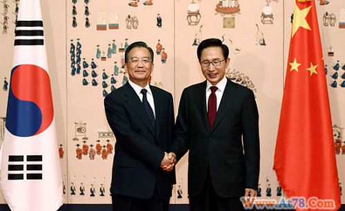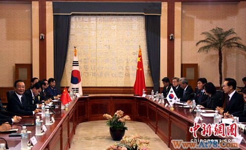 温家宝表示,近年来,中韩关系取得新发展,两国建立了战略合作伙伴关系,政治互信进一步加深,各领域交流合作成果丰硕,在重大地区和国际问题上保持良好沟通与协调。在应对国际金融危机过程中,两国密切合作,维护和促进了共同利益。中韩都是东亚重要国家,拥有广泛的共同利益,也肩负共同的责任。中方把发展同韩国的关系放在周边外交的重要位置,愿同韩方一道,着眼大局和长远,加强沟通、协调与合作,造福两国人民,促进地区和平与繁荣。
