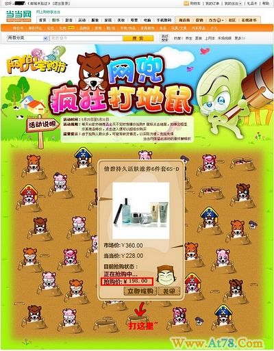 像往常一样她又在上班时间偷偷砸地鼠,我非常好奇这个游戏有什么好玩的?突然她一脸窃笑,看得我又是一阵莫名其妙。经不住诱惑,我打开游戏FLASH界面开始自我实践。瞧着我笨笨的样子,她笑我:“美女,你真的OUT了!”。我茫然地转过头等待她的下文,“你这么瞎玩不行!职业点好不好?”她无奈地看向我。“玩这个游戏能砸出超低价商品的!前几天听朋友说她通过这个游戏在当当网买了一堆超便宜的东西,我也要试试手气,看看我能买点啥便宜的好东西!”我一听恍然大悟,原来是限时折扣!我立马来了兴趣,脑子里刷刷地闪过一件件化妆品。