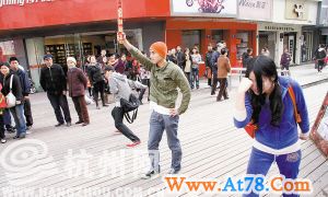 雷人的造型一出,原本来来往往的行人都“定格”了,目瞪口呆地看着这三个奇怪的“雕塑”。