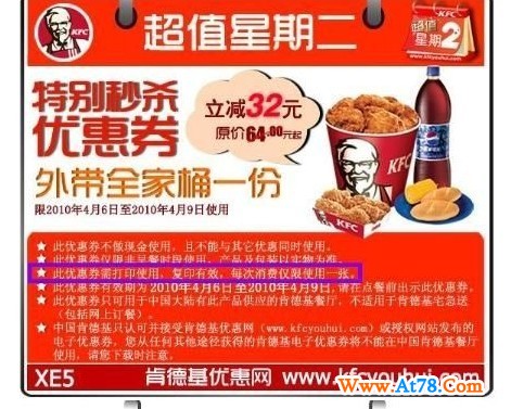 4月6日,KFC在优惠网和淘宝上推出的“特别秒杀优惠券”,以往64元才能买到的外带全家桶,凭券只要32元。尽管肯德基全国只推出100张 “秒杀券”,可票上却标注着“可打印使用,复印有效”。很多人拿着打印出来的“秒杀券”来消费,却被门店告知不接收,并将它们定义为“假券”。此后,常州 多家肯德基门店都聚满了前来“讨说法”的市民,有的店里多则上百人,一度闹得很凶。