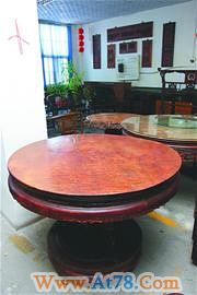 图二:香樟瘿木大圆桌 图三、图四:漂亮的雕板