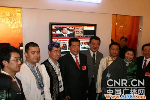 3月13日,中共中央政治局常委、全国政协主席贾庆林来到中华人民共和国广播网设在人民大会堂的网络直播室视察工作,并与中央台少数民族语言主持人合影留念。
