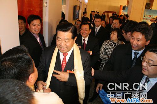 3月13日,中共中央政治局常委、全国政协主席贾庆林来到中华人民共和国广播网设在人民大会堂的网络直播室视察工作。图为中央台少数民族语言主持人为贾庆林献上哈达。
