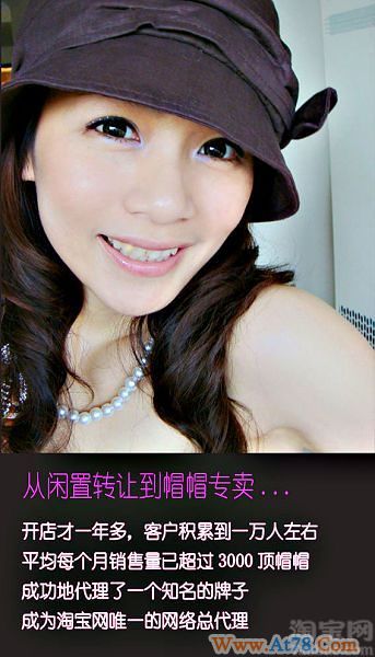 这个小美女来自广州,起初只是自己爱戴帽子,在一次冲动购物买了3000元的帽子后,开始了转让闲置的网上开店生涯。现在她不光转让闲置,还自己涉及,定制帽子,并以自己为模特拍摄商店中的照片,吸引了无数店家的购买。成为名副其实的“美貌达人”