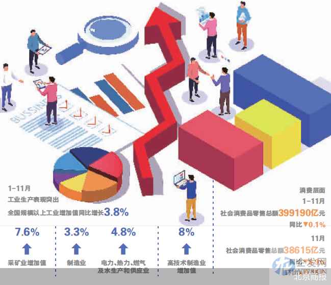 11月国民经济运行总体延续恢复态势。12月15日,国家统计局发布数据,1-11月,全国规模以上工业增加值同比增长3.8%,其中高技术制造业增长较快;固定资产投资规模继续扩大,高技术产业投资较快增长;市场销售略减,基本生活类商品销售和网上零售较快增长。