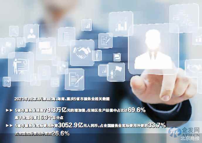 数据显示,2021年,上述5省市服务业创造了9.3万亿元的增加值,在地区生产总值中占比达69.6%,高于全国均值16.3个百分点;5省市服务业实际使用外资3052.9亿元人民币,占全国服务业实际使用外资的33.7%、占全国实际使用外资的26.6%。