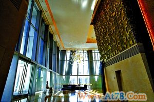 国贸三期商业裙楼的大厅,电梯上方悬挂着巨型灯。这个大厅里还设有110米长的超大防火隔烟