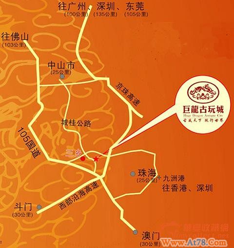 巨龙古玩城位于中山市三乡镇,毗邻珠海,距澳门、九州港、中山港仅需半小时车程,巨龙古玩城西面为广珠公路,东面为巨龙博览大道。港珠澳大桥开通后,巨龙博览大道将会是一条交通要道,因其北至珠海大金鼎,南通珠海拱北。广珠轻轨开通后中山至广州仅需27分钟便可到达,由此可见巨龙古玩城交通四通八达。