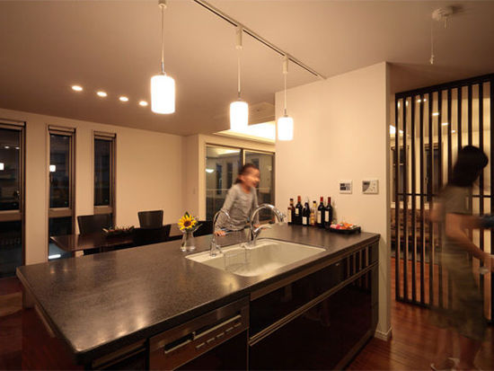 编辑点评:用黑色色的人造石做中岛厨柜的台面,为房子外墙增加颜色层次的同时,餐厨以木栅栏作为半阻隔,保持空间开阔,同时增添立体感。