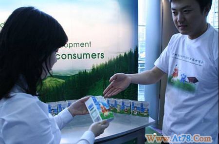 想借机利用我喝过伊利这是跟他搭个讪,仔细看看他手上的奶,诶?怎么跟我平时喝的不一样呢,仔细一听“送奶工”的介绍才知道原来这是伊利特别为了世博会打造的纪念装。