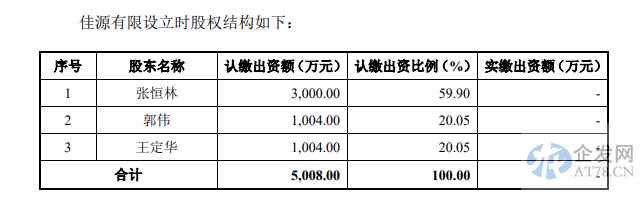 招股书显示,佳源科技的前身为佳源有限。2014年5月20日,张恒林、郭伟、王定华共同出资5008万元设立佳源有限,三者各自认缴出资比例分别为59.9%、20.05%和20.05%,为公司的创始人。