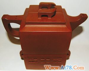阴阳无极壶以深藏多年的原矿特级紫砂为原料,在设计中融入中国太极元素,以抽象方式表达金木水火土五行意念。壶呈正方形,轮廓清晰、线条流畅、古朴雅致、挺括秀气。整个壶分为上下二部分,上半部是壶身,下半部形似八卦炉,可以拆卸,可以合一,构思巧妙。而壶身又分割为阴阳两份,分别可以同时泡两种茶,壶嘴上有两个出水口,壶柄手捏处有对应的两个小洞,利用气压原理,用大拇指按住不同的小洞,则可以缓缓倒出壶身中不同茶水。壶下半部分的八卦炉可以点蜡烛、燃炭火,以保持茶温。整个壶制作工艺严谨、比例协调,转换吻合贴切紧密,实为壶中精品。这把壶在去年举行的第十一届中国工艺美术大师精品展中荣获特别金奖。