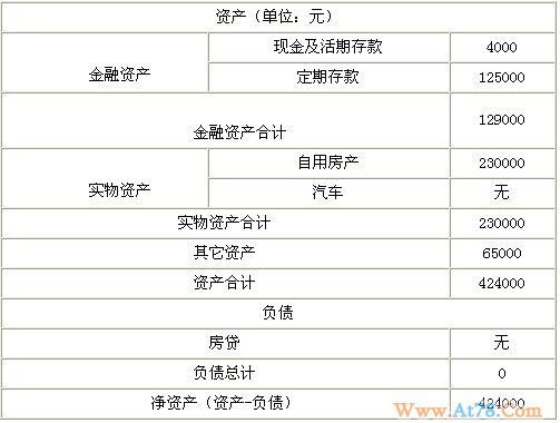 家庭日常生活支出为每月4000元,另每年有教育及其它费用13000元。现有资产424000元,其中现金及活期存款4000元,定期存款125000元,房产市值230000元,其他资产65000元。家庭没有任何负债。