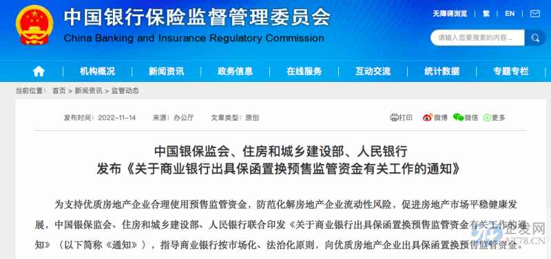 据中国银保监会官网消息,为支持优质房地产企业合理使用预售监管资金,防范化解房地产企业流动性风险,促进房地产市场平稳健康发展,中国银保监会、住房和城乡建设部、人民银行联合印发《关于商业银行出具保函置换预售监管资金有关工作的通知》(以下简称《通知》),指导商业银行按市场化、法治化原则,向优质房地产企业出具保函置换预售监管资金。