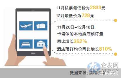世界杯开幕在即,卡塔尔当地的酒店也变得“抢手”起来。据携程数据,11月14日-20日,卡塔尔当地酒店的预订量同比增长291%,酒店预订均价同比增长459%。11月20日-12月18日,卡塔尔的本地酒店预订量同比增长352%,酒店预订均价同比增长810%。