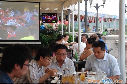 蓝色港湾酒吧成了深夜看球的主战场,基本都有大电视和投影仪。