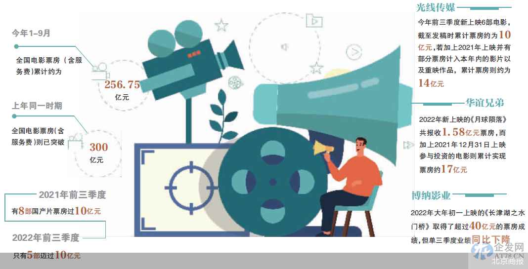 以光线传媒为例,北京商报记者依据公开资料统计发现,该公司今年前三季度新上映6部电影,截至记者发稿累计票房约为10亿元,若加上2021年上映并有部分票房计入本年内的影片以及重映作品,累计票房则约为14亿元。而在往年,光线传媒仅凭一部热门电影便能获得15亿元、最高可过50亿元的票房。