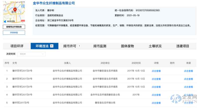 蓝鲸财经现场记者广州市防尘网生态环境保护服务站了解到了,仅2017年间,苍生化学纤维便陆续因违反《中华人民共和国大气污染防治法》、项目配套的建设环境保护设施没经工程验收私自资金投入生产制造,而备受环保处罚。