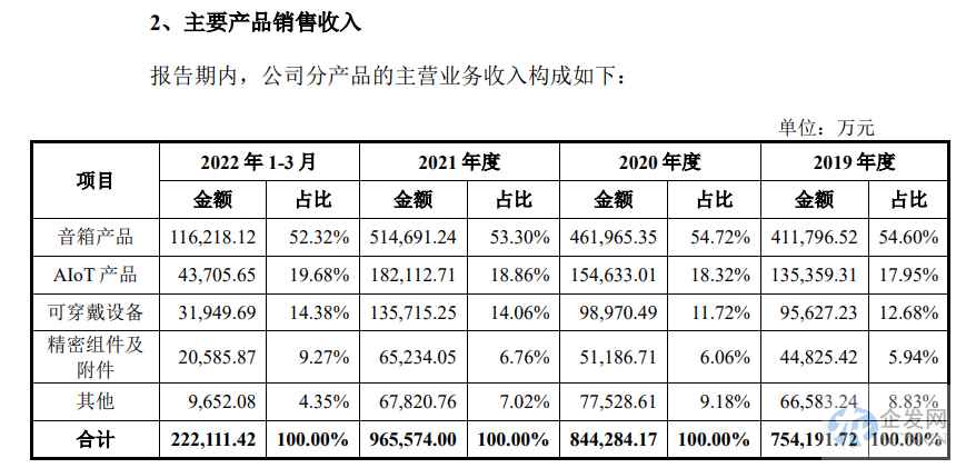 为了寻找新的增长点,通力股份已在积极布局新的产品线。与2019年相比,通力股份的音箱收入在总营收中的占比就下降了2.28个百分点。而AIoT产品、可穿戴设备以及精密组件及附件的收入在当期收入中的占比都有了不同程度的上涨。