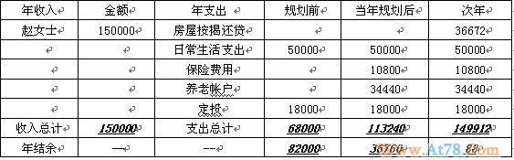 在保证现有生活水平不下降的前提下,按年通货膨胀率3%,预期其寿命80岁,经过测算赵女士退休后的生活费用至少约需要273万元。建议立即开立养老帐户,每月2870元定投年回报率为8%的指数型基金,届时即可累积资金273万元,用于养老支出。45岁后转为回报率稍低的稳健型投资。