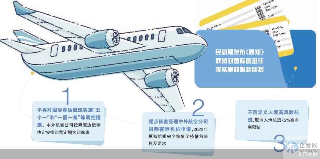 此次发布的《通知》,明确自2023年1月8日起,不再对国际客运航班实施“五个一”和“一国一策”等调控措施,中外航空公司按照双边运输协定安排运营定期客运航班。