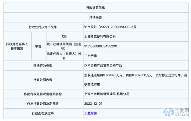 12月19日,蓝鲸财经记者从天眼查获悉,因以不合格产品冒充合格产品,上海罗森便利有限公司日前被上海市市场监督管理局机场分局罚款6.4万余元,并没收违法所得3.4万余元。