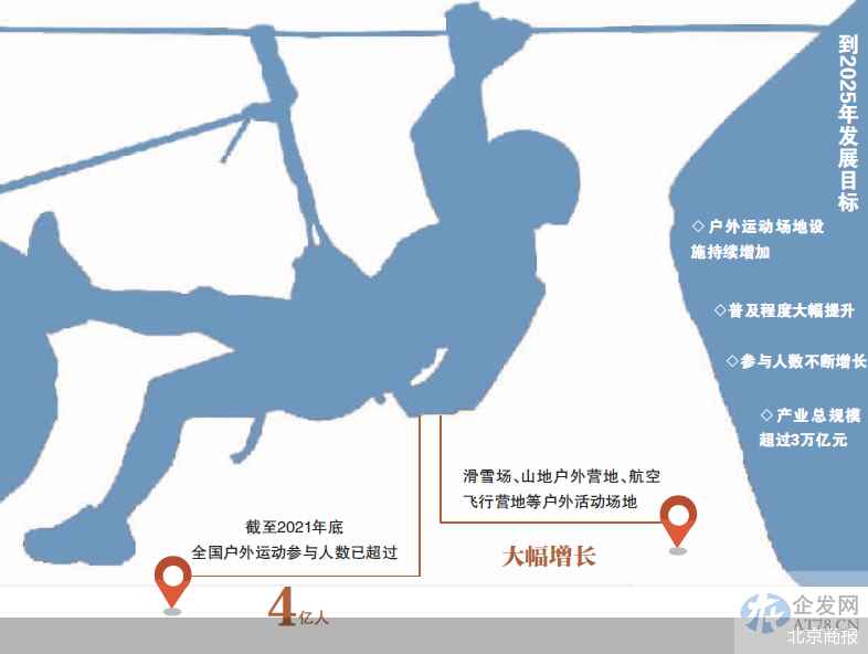 到2025年,户外运动产业高质量发展成效显著,基本形成供给与需求有效对接、产业与生态协调发展、产品与服务品牌彰显、业态与模式持续创新的发展格局。户外运动产业总规模超过3万亿元。