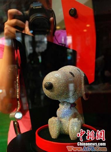 这么多史努比当中,最引人眼球的当属一只由9917颗白钻、783颗黑钻和415颗红宝石镶成的,共重207克拉的钻石史努比,价值人民币250万元。