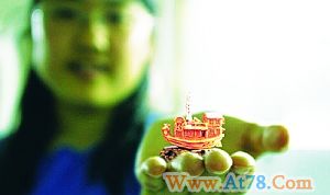 果核原是人们食后的弃物,但是小小的果核在古代就成了艺人发挥想象和施展刀技的载体,橄榄核、桃核、杏核都是核雕的首选材料,因其体积微小,因此在众多的雕刻中核雕反而显得特别珍贵。来自辽宁省的艺人将在文博会上带来惊喜。经过6个月的考证、揣摩,该艺人在3厘米桃核上刻出《核舟记》,结束了“只闻其文道神奇,未见其物数百年”的历史,并在此作品的基础上进行重新创作,把作品中八扇窗镂空,“诗”刻到船背上,舱内加进吹箫人、书章、客人等,共计9人。