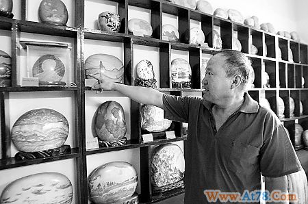 每一块石头的发现,肖来保都能讲出一段感人的故事。拿一瓢水往石头上一泼,堆放在肖来保家门口的石头现