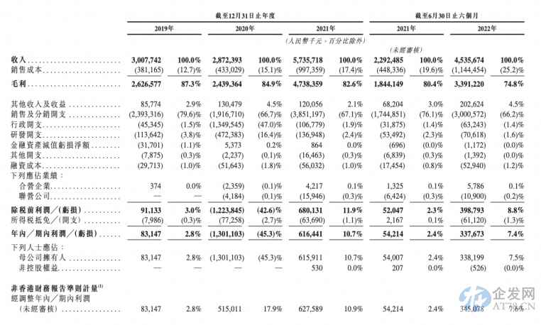 与此同时,上述报告期内,该公司产生重大销售及分销开支分别为23.93亿元、19.17亿元、38.51亿元及30亿元,分别占各期间总收入的79.6%、66.7%,67.1%及66.2%。由于较高的销售费用率,该公司同期的净利润率也较低,分别为2.8%、-45.3%、10.7%及7.5%。