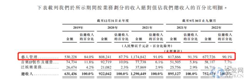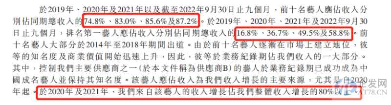 虽然艺人数量不少,但能为公司创收的艺人却不多。招股书显示,2022年前三季度,前十名艺人应占收入为总收入贡献87.2%,是近四个报告期最高占比,排名第一艺人的收入占同期营收的比重甚至高达58.8%。