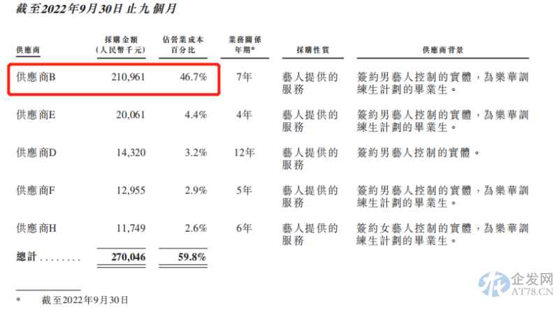 同时,乐华娱乐还提到了“供应商B”对公司的重要影响力,自2020年起该艺人就成为了公司收入增长的主要来源。2020年/2021年,乐华来自该艺人的收入增长占总体收入增长的八成以上。结合业务关系年期、交易金额等信息,业内猜测“供应商B”和“排名第一艺人”很可能都是乐华旗下顶流艺人王一博。