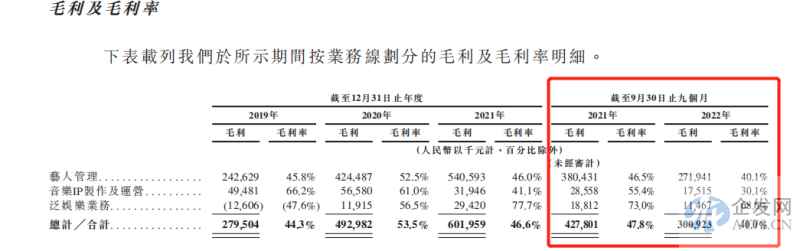 同时,报告期内公司的毛利为3.01亿元,同比减少29.67%。毛利率为40%,同比下降7.8%。招股书数据显示,前三季度,乐华旗下业务全线的毛利及毛利率都出现了不小的下滑,主力军艺人管理业务的毛利同比减少28%,音乐IP制作及运营业务的毛利率更是同比下降25.3%。无论是收入端,还是利润端,都呈现出颓势。