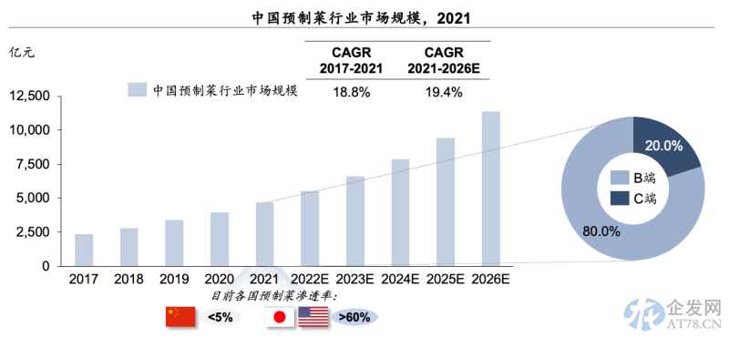 数据显示,中国市场预制菜渗透率小于5%,日本美国预制菜的市场渗透率超过60%。2022年中国预制菜市场规模将超过5000亿元,2021-2026年的复合增长率将达19.4%,2026年市场规模约为11000亿元。