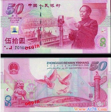 1999年发行的“庆祝中华人民共和国成立50周年”纪念钞,面值50元,现在市价300元左右。