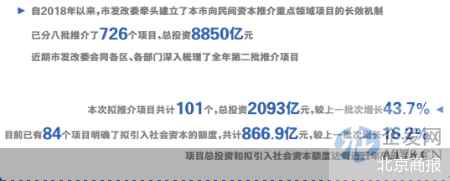 事实上,自2018年以来,北京市发改委牵头建立了本市向民间资本推介重点领域项目的长效机制,已分八批推介了726个项目,总投资8850亿元。
