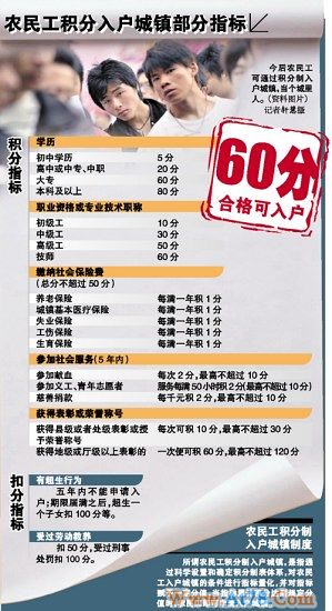 在职业资格或专业技术职称上,初级工10分,中级工30分,高级工50分,技师60分,也就是说,一个具备技师资格的农民工原则上也可以直接入户。