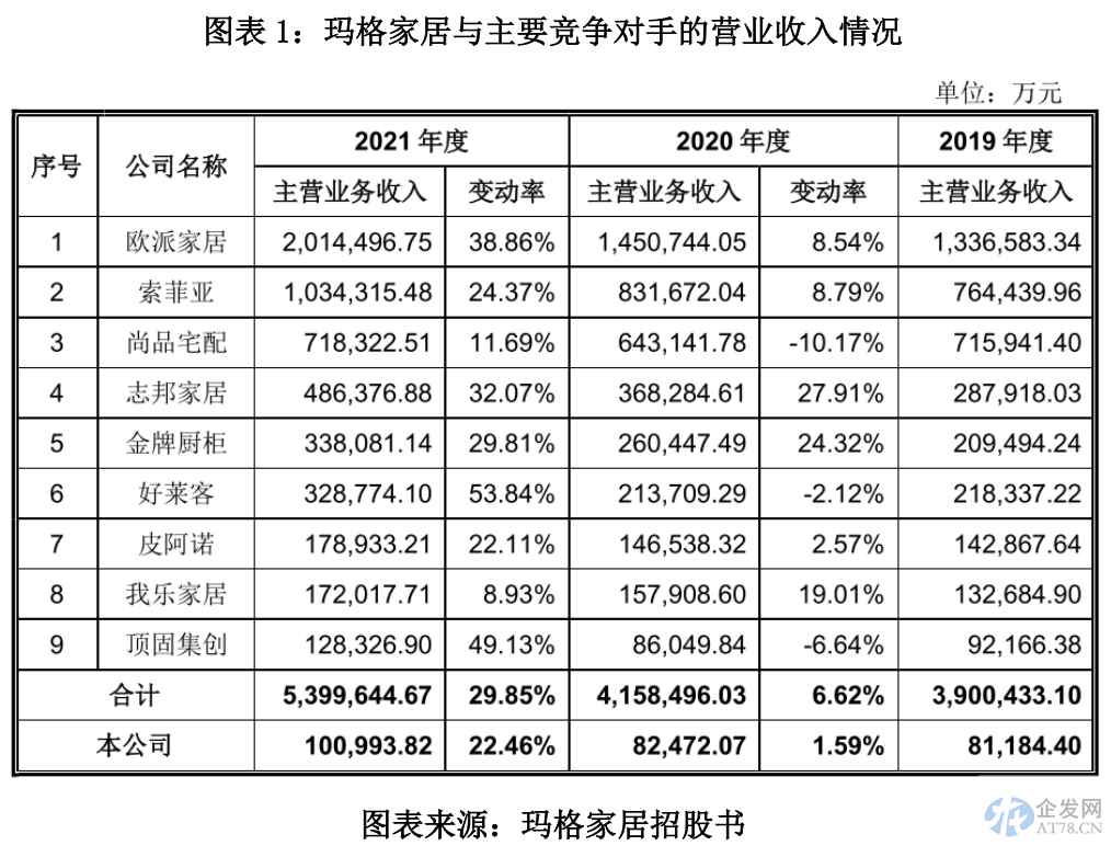 不仅如此,2021年,玛格家居的营收增长率也不及同行均值。9家竞争对手的平均营收增长率为29.85%,而玛格家居为22.46%。