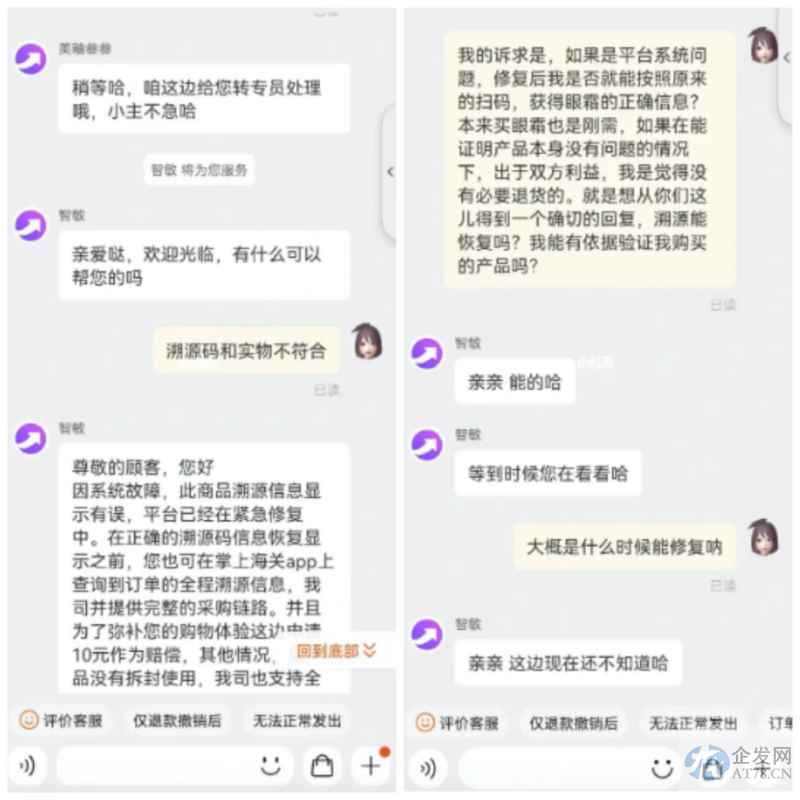 而当该用户追问系统何时能修复,以便其重新扫码获得眼霜的正确信息时,客服便一再推诿,或者一再转客服拖延处理。这让用户对该产品的品质产生质疑。