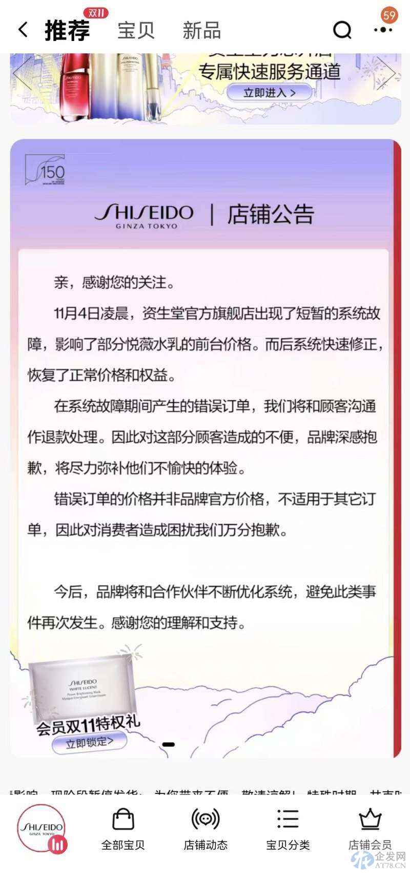 据消费者反映,11月4日凌晨资生堂官方旗舰店直播间开卖的一款悦薇水乳套装只需888元,比李佳琦直播间的同款商品到手价便宜300多元。对此,资生堂天猫官方旗舰店发布公告,将官方低价解释为“系统故障”,并表示将对异常订单统一做退款处理,并给以适当补偿。