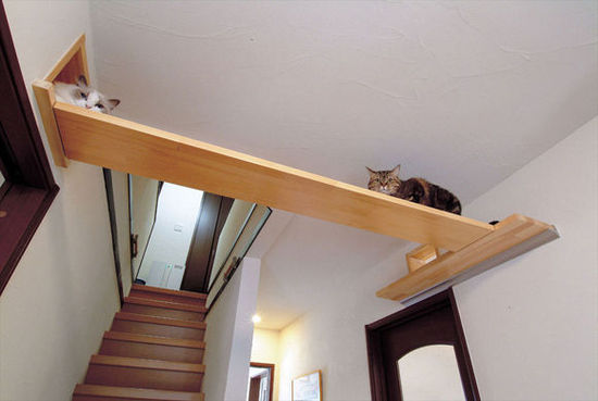 玄关的设计非常简单,头顶上的这条横栏是连接起居室与阁楼的过道,同时也是猫猫们最爱的地方。像这样,它们还会在玄关迎接客人的到来。